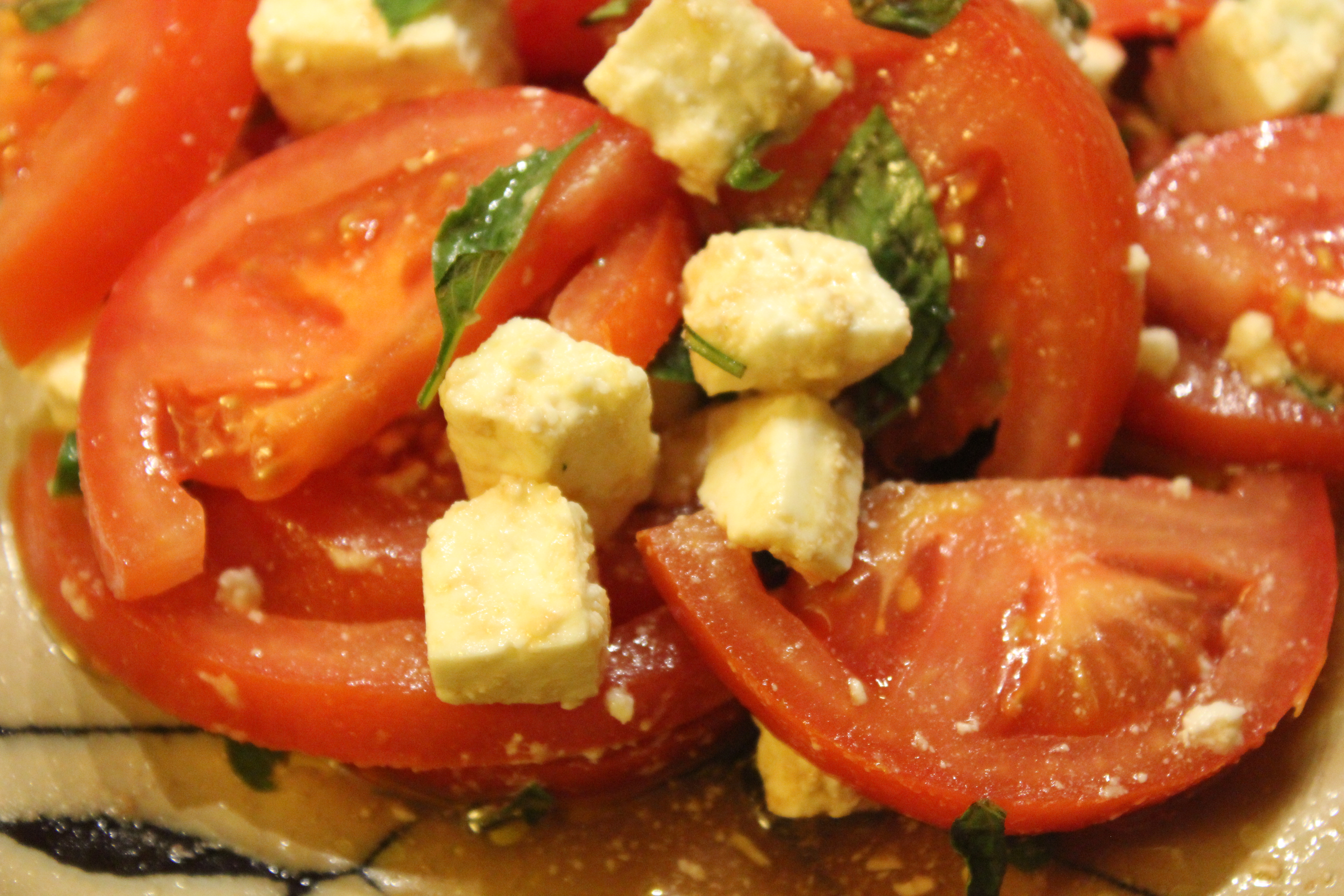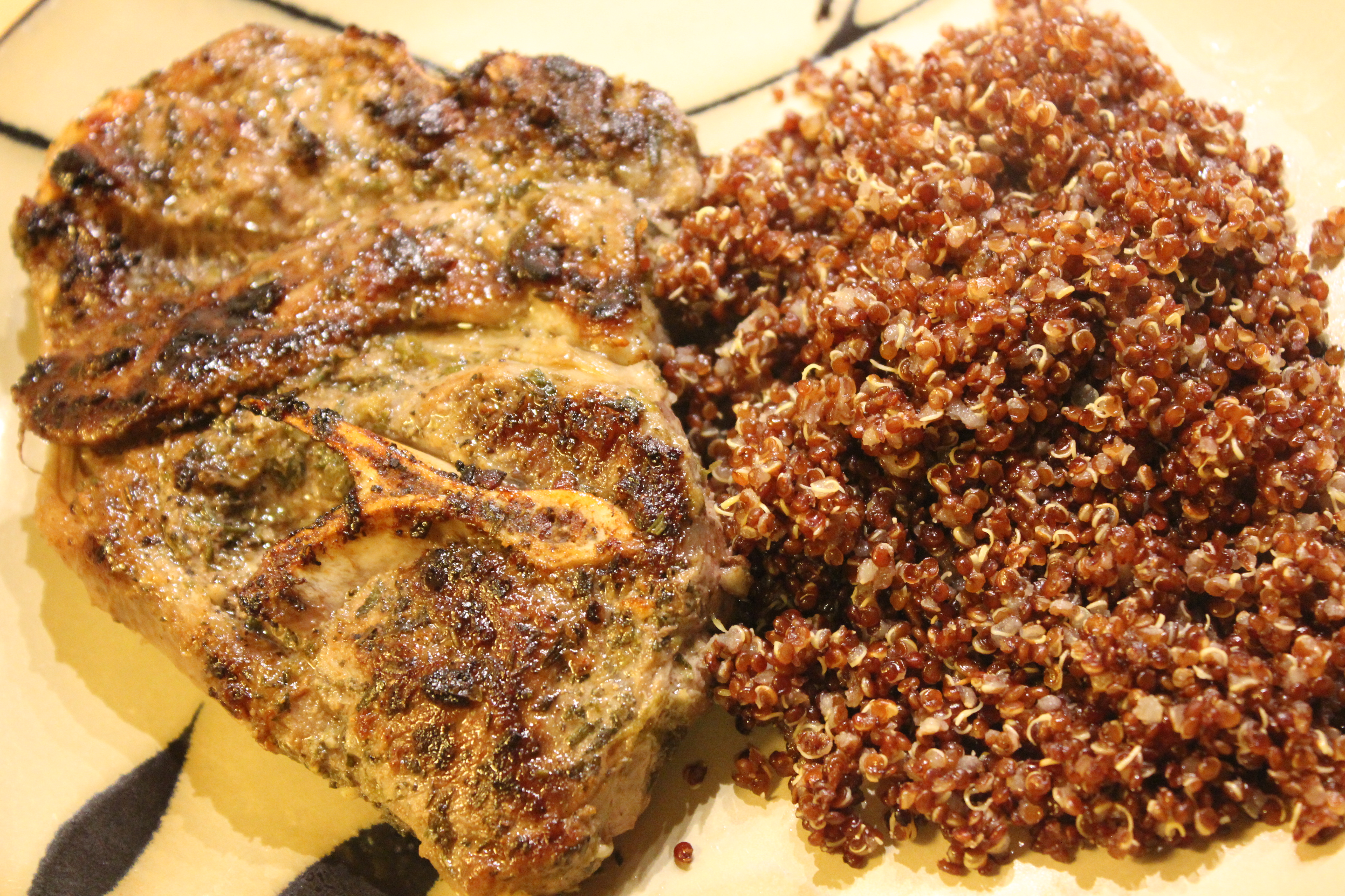 I wasn’t in the mood for firing up the grill so instead i fired up the indoor grill pan. Love it! I grilled off the lamb and let me tell you– the aroma from the marinade was amazing. I was feeling a bit daring so I cooked it to a medium rare and it was divine! I also made red quinoa to go with it as well as some roma tomatoes with a balsamic and oil vinaigrette topped off with basil and feta. YUM!