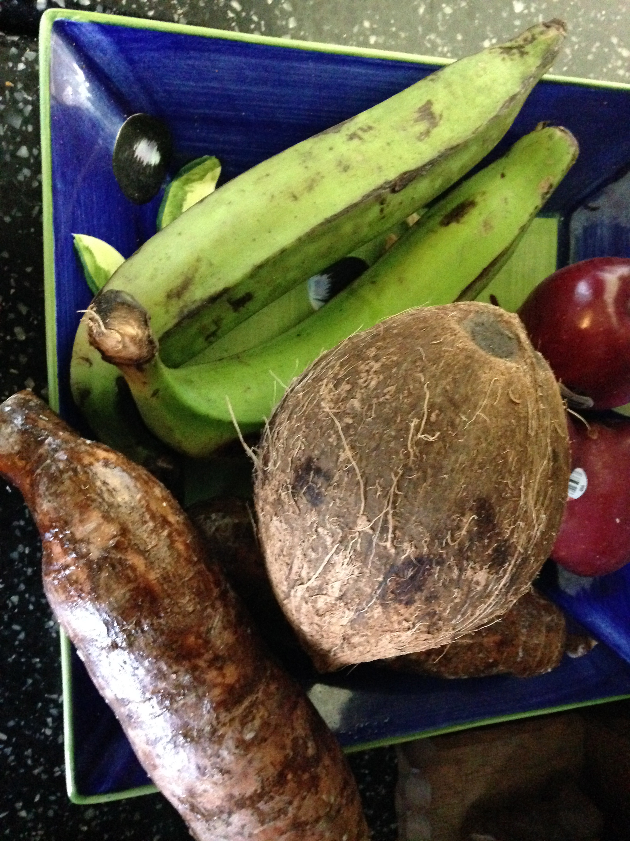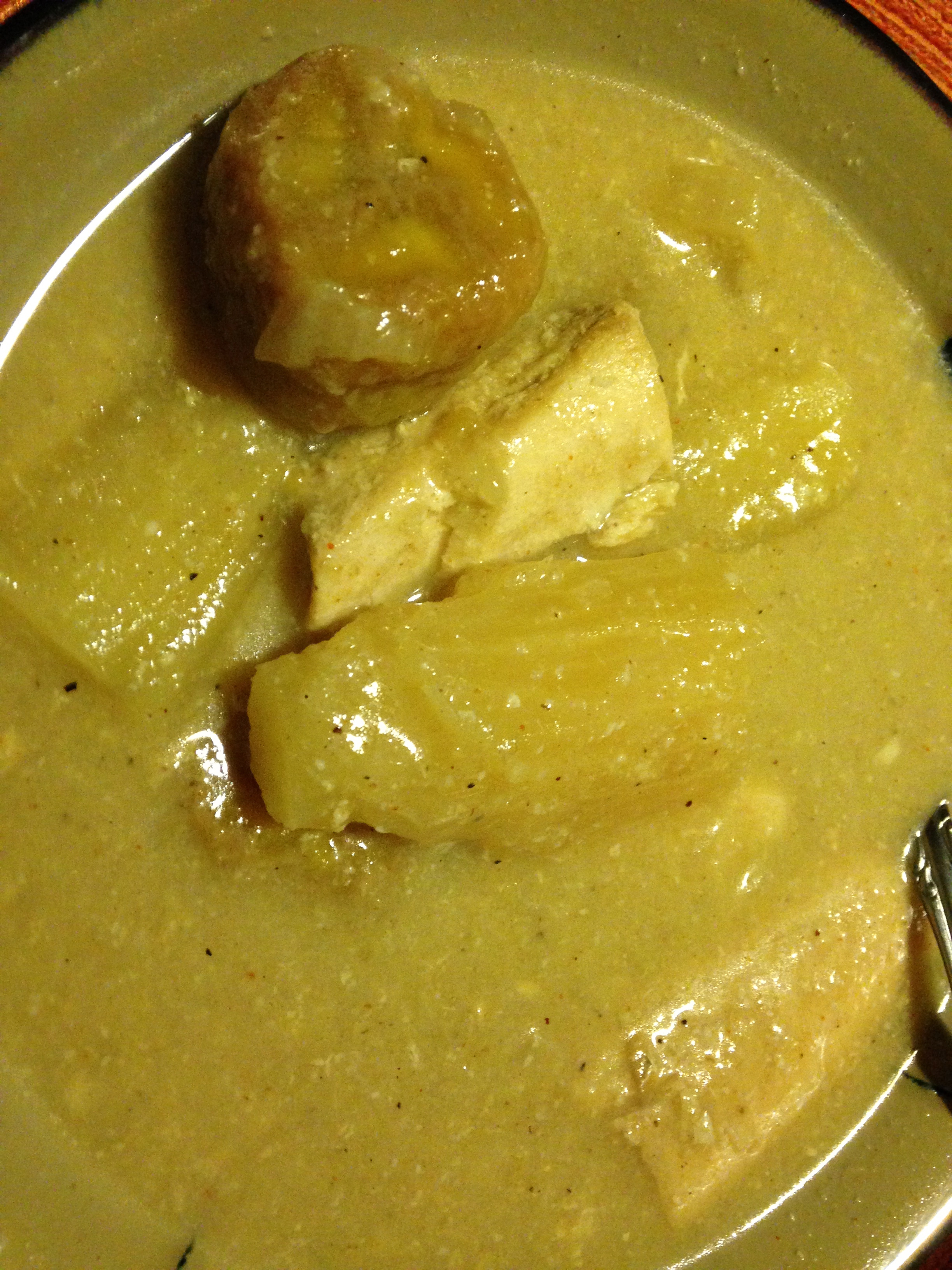 So my went to work to make Sopa de pescado con coco with platanos verdes and yucca. The trick is making your own coconut water. So my dad dug into it, grated it, and then passed it through a sieve with some water and BAM– coconut water!