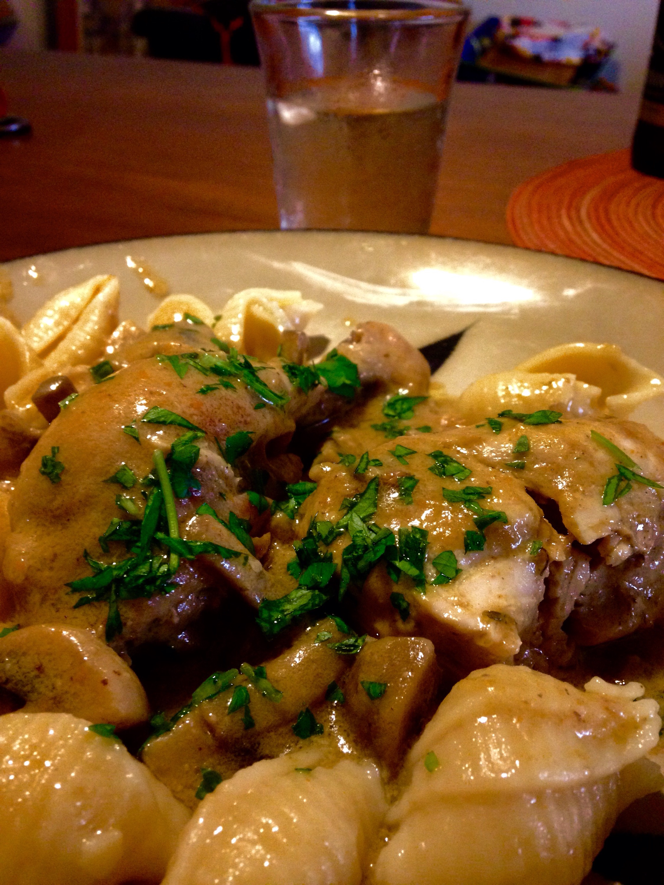 Wednesday night’s (because what better day to cook a Julia recipe than hump day, right?) Julia recipe was Fricassee de Poulet A L’ancienne (Old-fashioned chicken fricassee with wine-flavored cream sauce, onions, and mushrooms). Yep, a mouthful and man– was it a DELICIOUS mouthful!