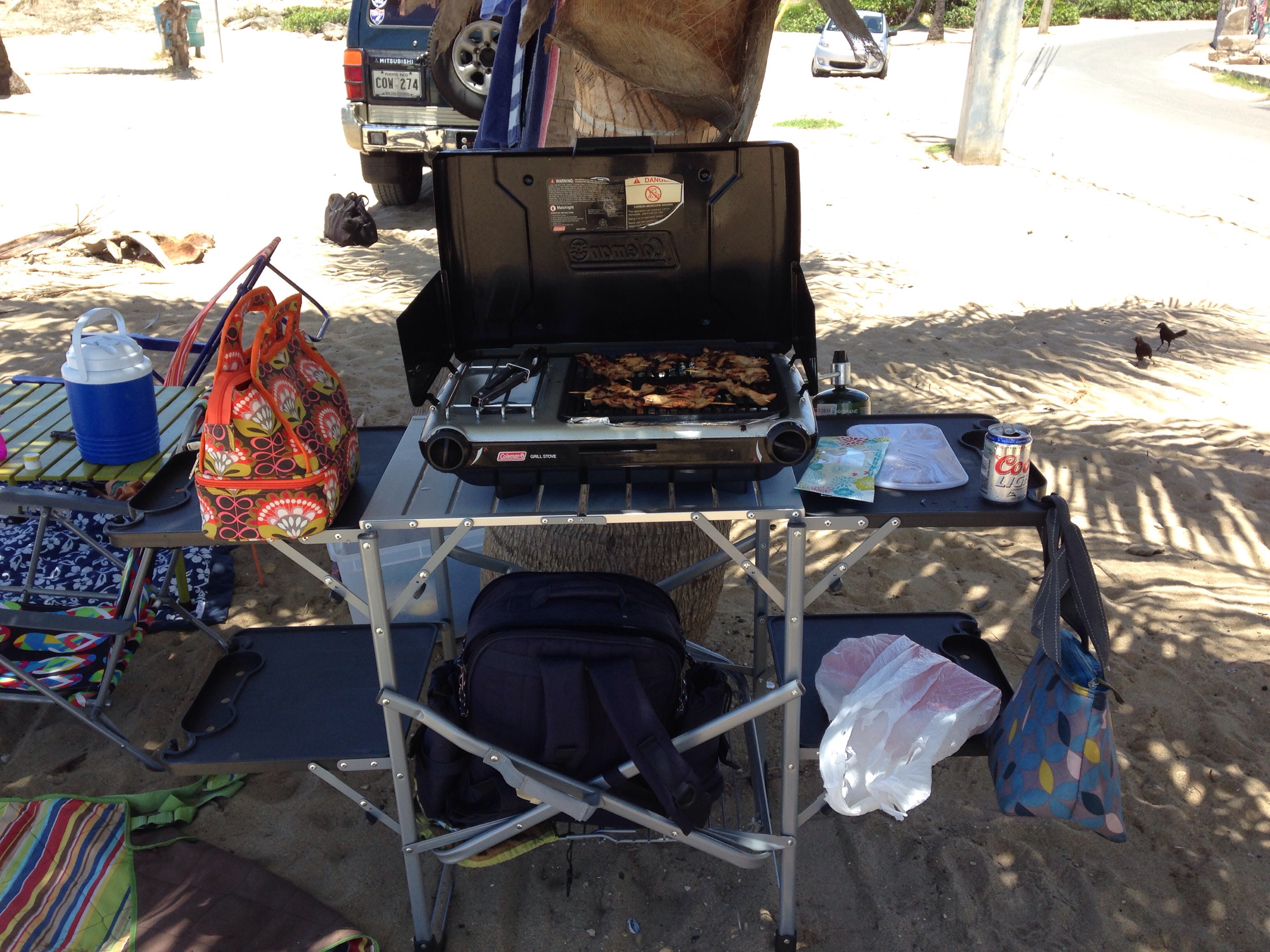 We have also added to our list of gear as well. Like we really need more, right? I was commenting to my father the other week that it would be helpful to have another table to put the cooking essentials on, rather than just have them haphazard  on a beach chair. We have a Table in a bag, kind of like this (but I don’t think we paid this much for it) that has worked out great. But the grill takes up most of the space and left us with our plates on our laps. Not very convenient.